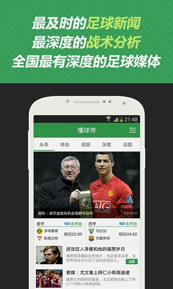 懂球帝是为广大足球迷量身打造的一款专业足球手机软件。专业+原创足球资讯;全球足球赛事直播:联赛+杯赛赛事资讯、赛程、球队球员详细数据,实时更新;精彩评论,圈子侃球,一键定制专属球队,场外花边+女球迷专访,让足球更精彩。