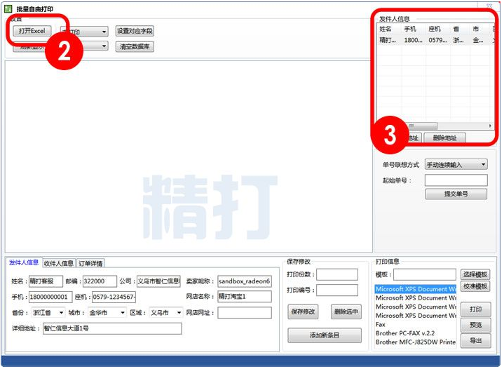 2.打开一个Excel文件,点击②处会弹出打开文件界面。关于收件人信息的调用与保存,请参照自由打印章节。