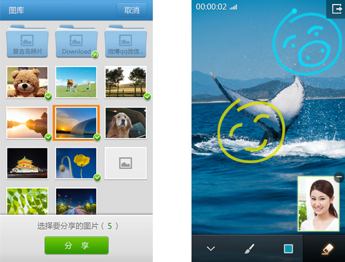 实时的图片分享功能,除了可以与好友分享手机中的精彩图片,双方同步浏览,照片涂鸦外,更结合手机操作特性,可以使用触点同步、同步涂鸦、手势图片缩放,滑动浏览等等便捷的交互方式。
