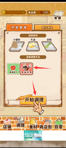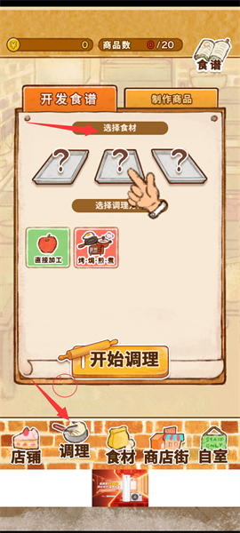 1、首先下载安装好游戏后,点击进入,在游戏界面中第一步点击【调理】,选择好我们需要制作的食材,放入盘中;