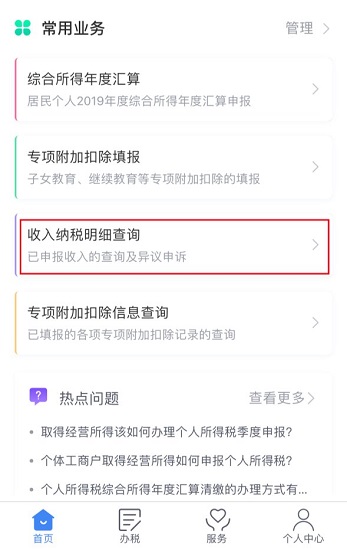 在首页依次点击【常用业务】-【收入纳税明细查询】,纳税记录年度自动选择“2020年”,可查看2020年度的“工资薪金”、“劳务报酬”、“稿酬”、“特许权使用费”四项综合所得的“收入合计”、“已申报税额合计”。