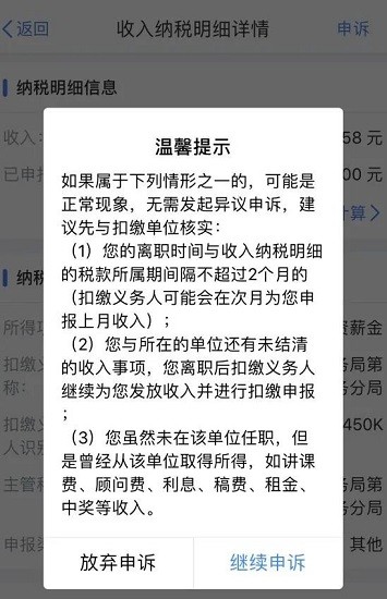 点击进入某一条收入明细还可以查看详细信息。若您发现某笔收入属于身份信息被冒用、本人确实没有取得的情况,您可以点击该笔收入,再点击右上角“申诉”。特别提醒:若属于“温馨提示”情形之一,建议先与扣缴单位核实,不需要发起异议申诉。