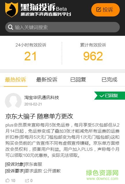 4.黑猫投诉平台支持广大消费者在受骗等情况下在线投诉,帮助解决的平台,平台由新浪推出,提供一个公正的买家与商家的沟通平台。