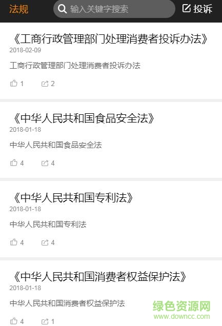 3.由于平台处于试运营的状态,因此投诉量相对较少。而在法规的页面上,则上传了专利法、消费者权益法等多部法律。