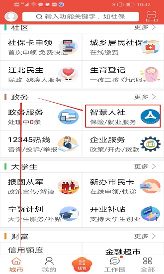1.进入软件后,在下方菜单栏中找到“城市”-“政务”-“智慧人社”