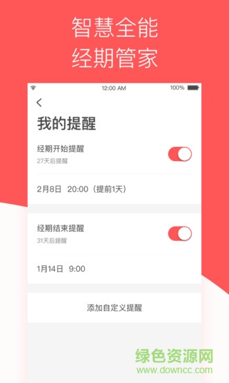 【贴心提醒】您可以根据自己的需求设置经期开始前和经期结束时的提醒及其他自定义提醒