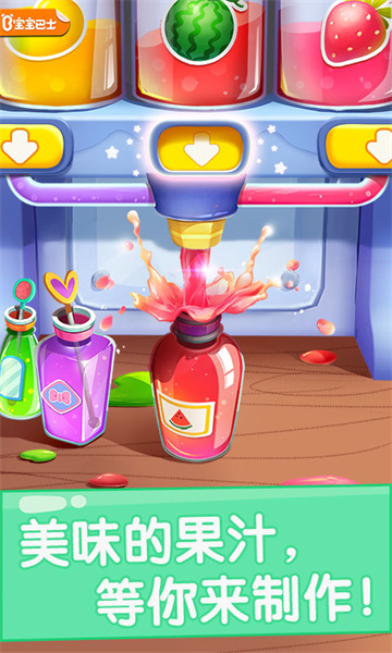 宝宝果汁商店是宝宝巴士出品的最新儿童游戏,孩子们可以在这里制作好喝的果汁哟,创造不同的口味,吸引大家来购买。欢迎大家来绿色资源网踊跃下载试玩!