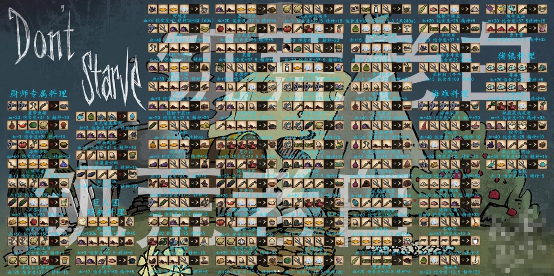 该图片包含了《巨人国》、《联机版》以及《整合篇》的食谱,为初入饥荒的新手玩家提供制作便利。