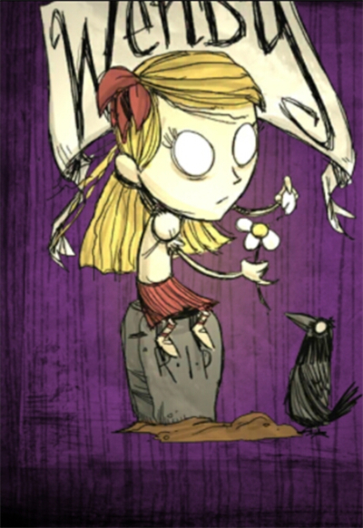 温蒂的三围与威尔逊相同,属于较正常的。温蒂被译成“丧失亲人者”,而她的亲人就是她的姐姐(或妹妹,谁知道她“sister”说的谁啊)。温蒂自带一朵荷花,这朵花在3天后(好像是)会完全绽开,标志就是花在物品栏中时上方会出现一个类似法阵的东西。这时把花扔在地上,并杀死一个生物(要求花和这个生物距离大约半个屏幕),然后花就会变成一个戴花的鬼魂,这就是姐姐。姐姐会跟着温蒂,但不会离得太近,否则姐姐会避开。姐姐自带一个小范围照明,所以这又为我们提供了一个无火把过夜的方式:不停追着姐姐跑,跑一晚上。