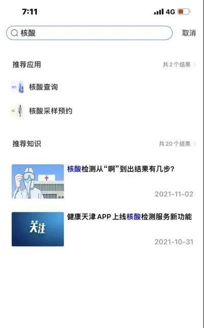 下载并打开“健康天津”App,在首页上方搜索栏中输入“核酸”,点击“核酸查询”