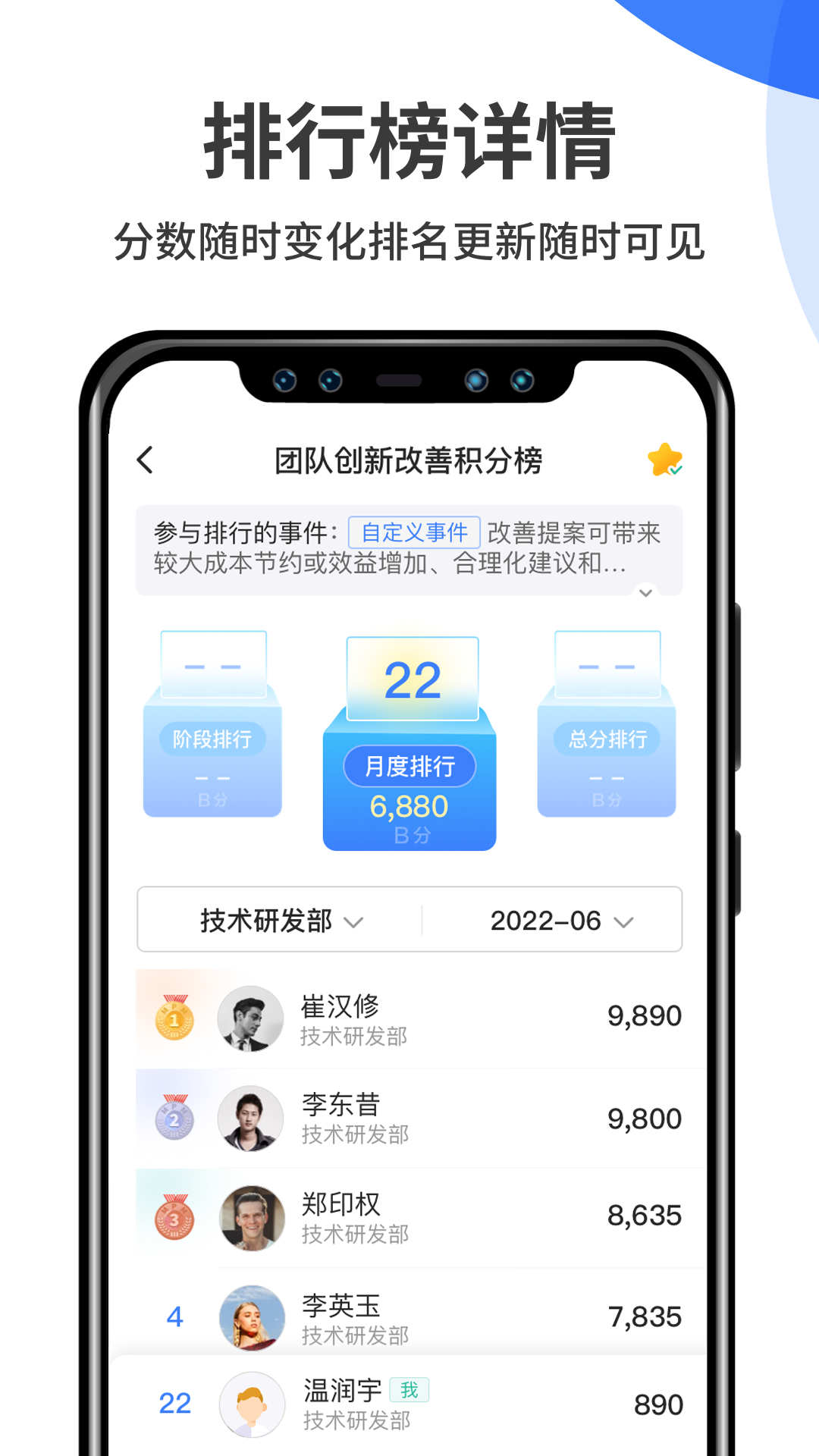 【积分排名】多种自定义分组排名展示模块。积分排名遵循动态公开的原则,分数随时变化、排名随时调整、更新随时可见。利用积分大数据的量化,实现更合理的评价机制。