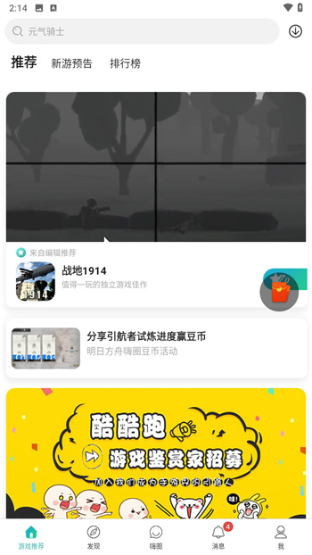 1、打开酷酷跑app后,在首页可以看到最上面的【推荐】,编辑会每日推荐精品好玩的游戏给用户;