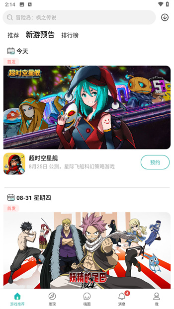 2、在推荐旁边是新游预告,会将每天首发的游戏以及各种即将上线的游戏更新在这个页面,能够及时通过这里发现新游戏;