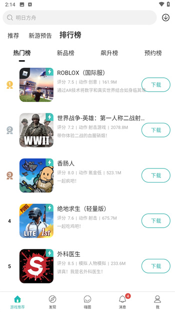 3、新游预告的旁边是排行榜,排行榜包含了热门榜、新品榜、飙升榜、预约榜等,分别满足不同玩家的喜好需求,轻松从榜单中找到自己想要体验的游戏;