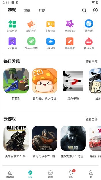 4、通过【发现】频道可以根据厂商、分类等不同的频道发现新游戏,另外还有玩家分享、steam移植、精品汉化、国际服、最新测试、离线游戏、主播热游等不同的频道;