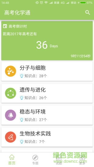 高考生物通包含高考生物科目下的所有高考知识点详解,具体的有分子与细胞、遗传与进化、稳态与环境、生物技术实践、现代生物科技专题等几个大的模块