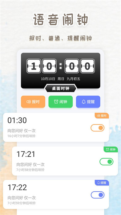 语音播报闹钟是一款简单易用的语音报时闹钟。