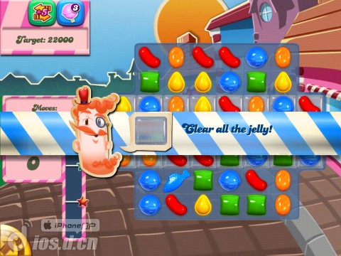 2、果冻清除:就是将铺在糖果下方的透明果冻消除,只要将果冻上方的糖果消除,果冻也会跟著消失。在后期的关卡里,果冻会越来越厚,甚至还有结冰的果冻,必须重复串消果冻上方的糖果两次以上才能彻底消除果冻,此类型关卡一样有棋步的限制。在这类型关卡中,建议集中消除果冻区及其周围的糖果,在最少的步数内消除完果冻能使你的分数得到很大的提升。