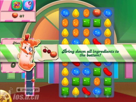 3、运送果子:在这一类型的关卡里,会有樱桃或苹果随机出现在棋盘上,必须一一消除下方的糖果,让水果们移动至最下方。规划如何消除糖果、运送果子时须特别注意这些果子同时出现在棋盘上的数量上限会因关卡而异。在这类关卡中,建议先对应消除水果所在列的糖果,尽量把水果放到中下方,这样有助于你完成任务。