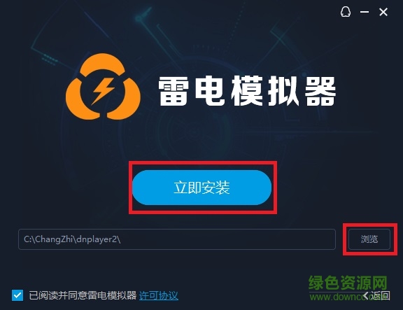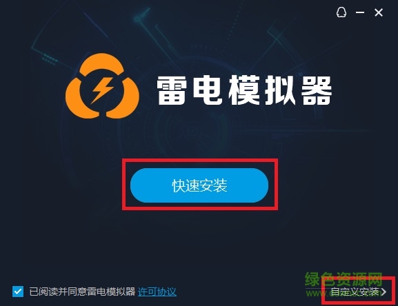 1、在绿色资源网免费下载雷电模拟器,双击打开下载的.exe文件,进入安装界面,用户可以选择快速安装或者自定义安装