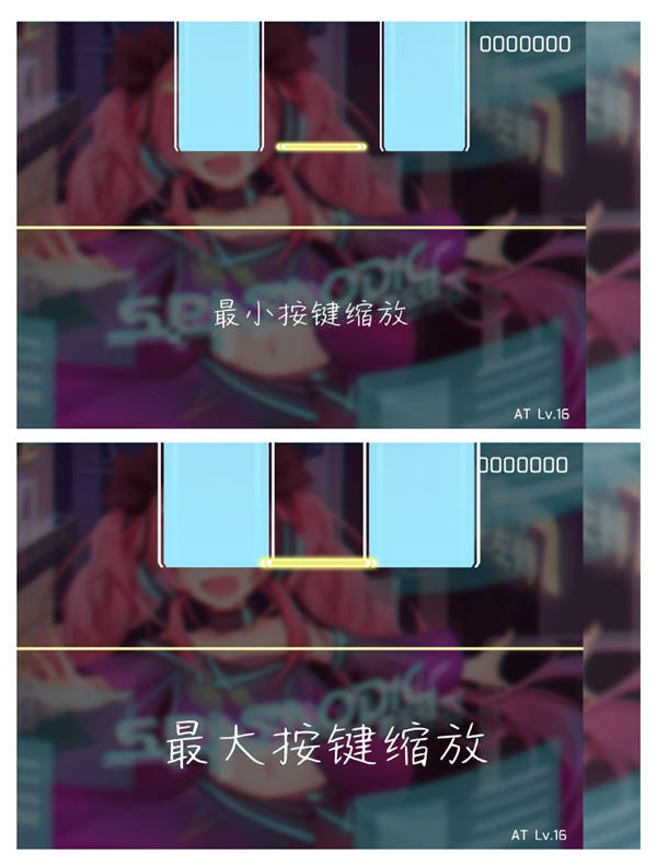 通过调整按键缩放,可以调整按键的大小(对所有的note都有效),不同的大小对于游玩的体验也是不同的。以Spasmodic(AT难度)为例,上面的图是最小note,下面的图是最大note。