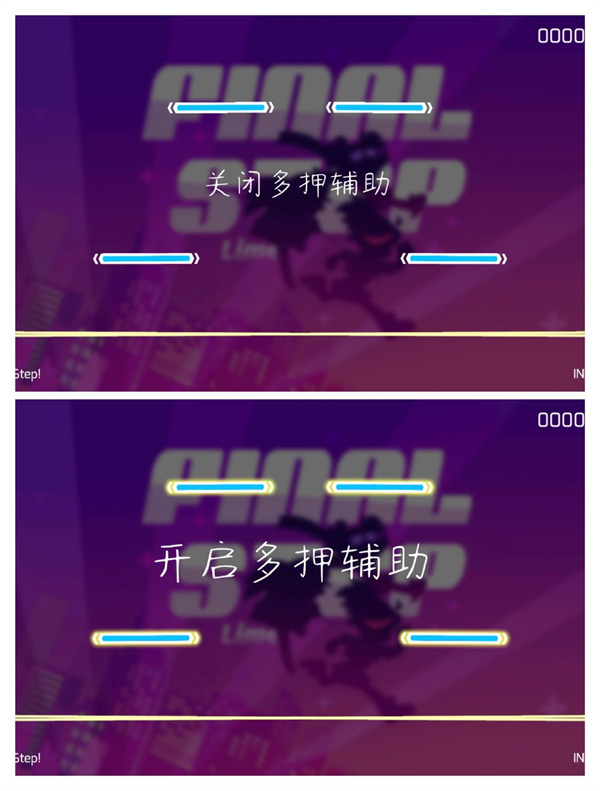 多押辅助可以有效分辨多押(多押是指同时有多个note需要同时击打)开启后会在这些note(包括长条)的旁边加上一圈金色的特效。