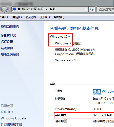 在弹出的属性窗口中查看“windows版本”和“系统类型”如图所示,可知该系统为windows7,32位操作系统,则下载上面对应的支持win7 32位系统的唯动手环同步软件。其他操作系统的查看系统版本方法类似。