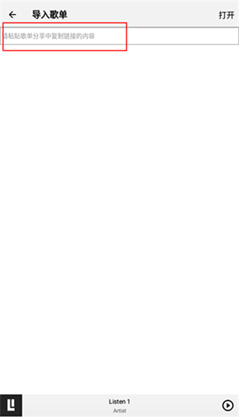 3.提前在歌单分享功能中复制好歌单链接,最后在【导入歌单】页面中,粘贴到框框中,点击右上角的“打开”即可导入成功。