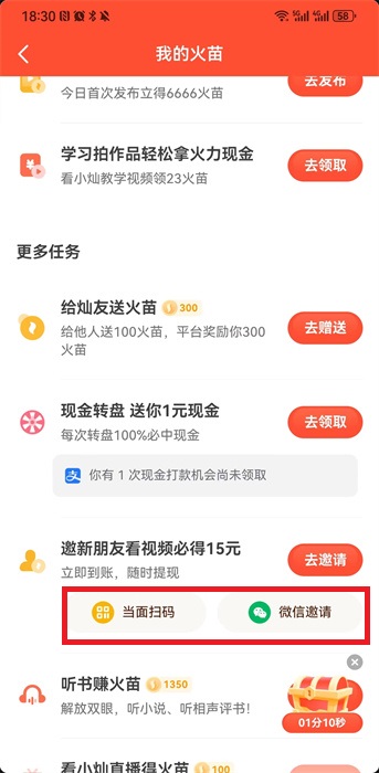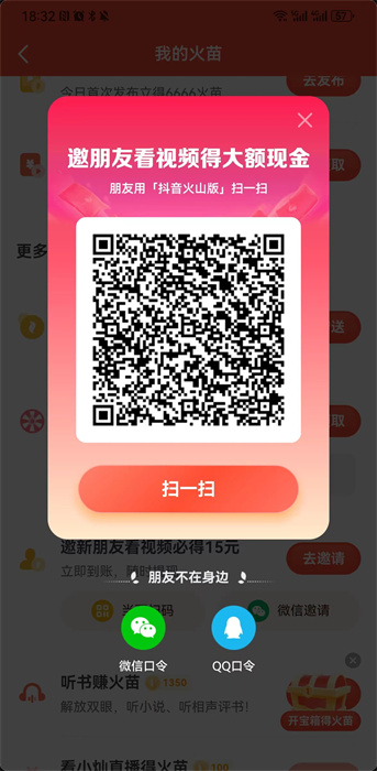 3、可以直接让用户扫码当面邀请好友,直接点击下方的【当面扫码】然后就会有【二维码】,让好友使用抖音火山版软件进行扫码即可;