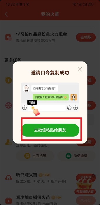 4、或者是点击下方的【微信邀请】然后就可以【去微信粘贴给朋友】,到微信的聊天界面发送给自己的好友即可。