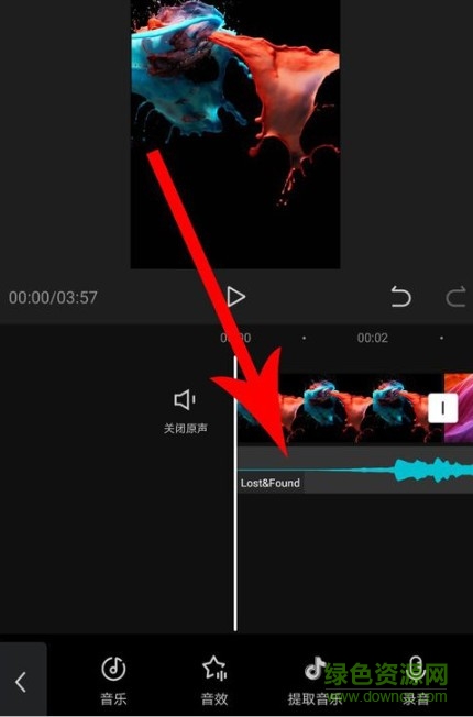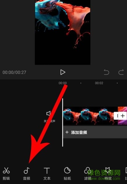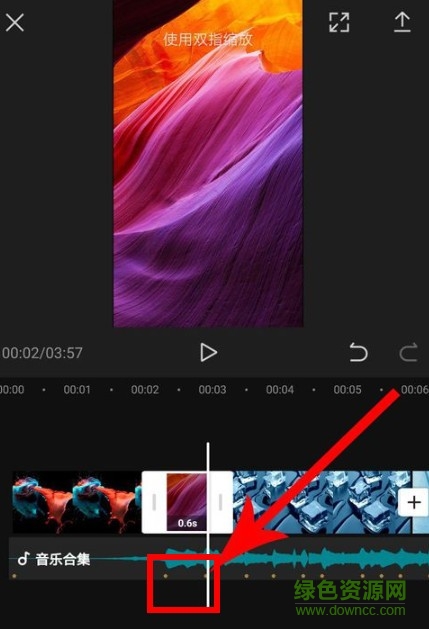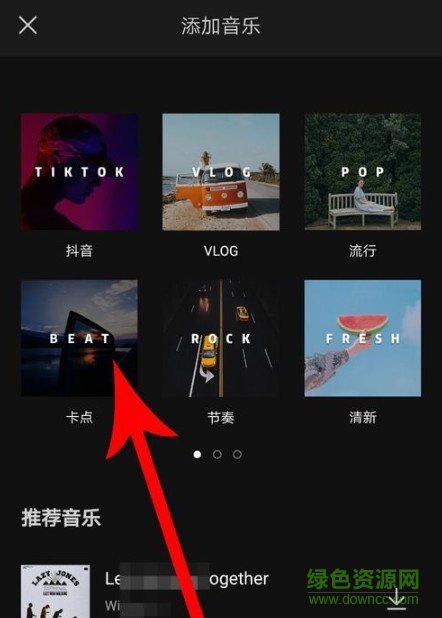 2、而在进入编辑界面之后,我们就可以找到底端的“音频”功能,并且从下方列表里选择“音乐”按钮,找到在线卡点的曲库。