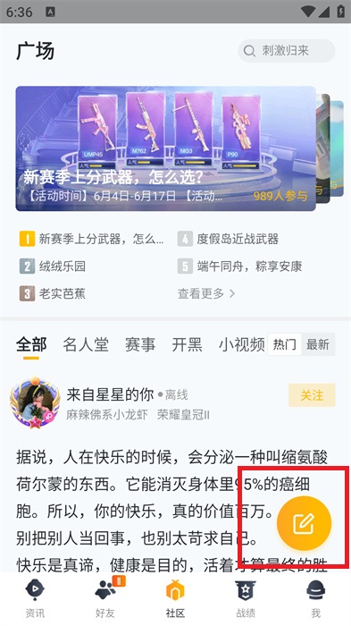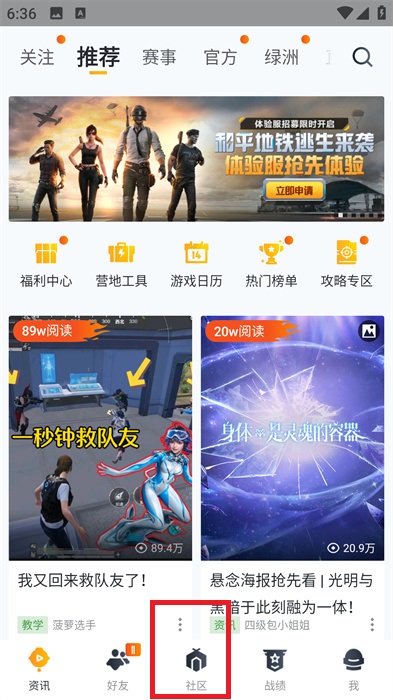 1、和平营地一键打开玩家社区,与更多玩家分享游戏体验,相互交流互动,敞开心扉;