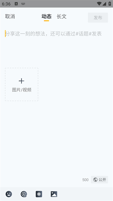 3、在动态发布界面,就可以看到文案的输入页面,还有图片和视频内容都可以添加,然后我们就可以输入想要发布的动态;