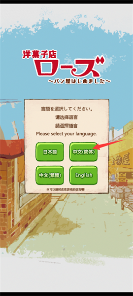 1、下载安装好洋果子店rose1游戏后,点击进入,在正式进入游戏之前就会有语言选择,日本语/中文简体/中文繁体/英文不同选项,可以根据自己需求选择,点击中文简体进入;