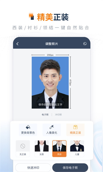 担心证件照没有穿正装?作为一款专业的证件照拍照软件,配备了种类齐全的正装模板,快速换装,效果自然好看,一秒实现证件照换正装的体验,给您刺激萌生的感受!