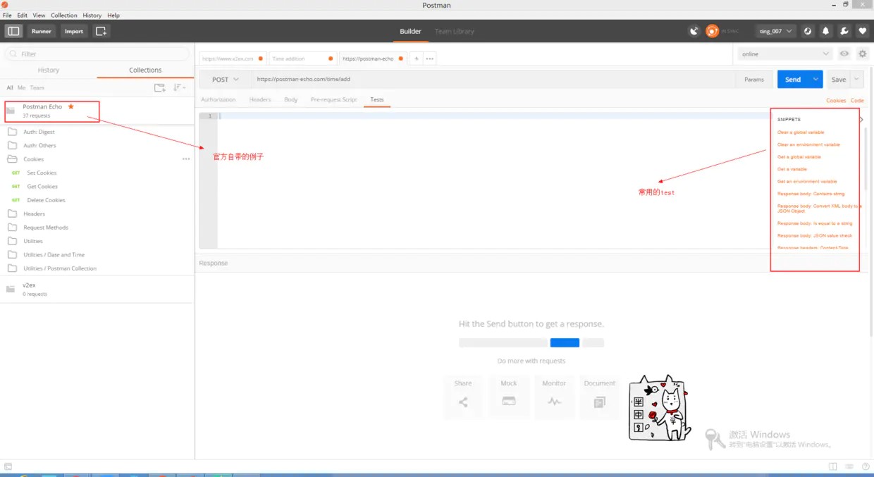 同时postman还有一个叫SNIPPETS的模块,里面防止了常用的一些test断言,直接点击就可以使用了,如果这里没有你需要的,可以查看帮助文档