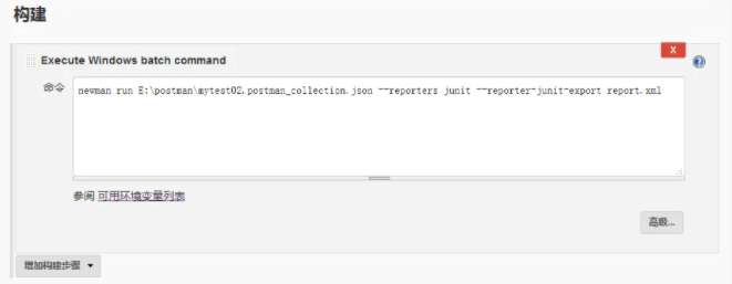 第二步:添加构建步骤,你自己决定输入什么,我这里指定newman执行某个文件件下的json文件,并以junit的报告形式输出到当前工作目录