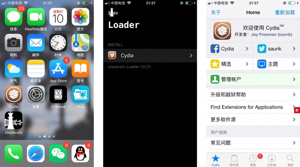 5、启动后设备桌面出现checkra1n App 双击打开安装Cydia