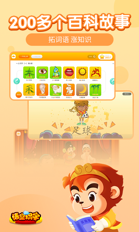 悟空识字是一款为3-8岁学龄前和一年级儿童早期阅读开发的识字软件。主要学习1200个汉字,十五个西游关卡,160余个识字游戏,60本阶梯阅读,开心广场、 欢乐谷、培优等内容。
