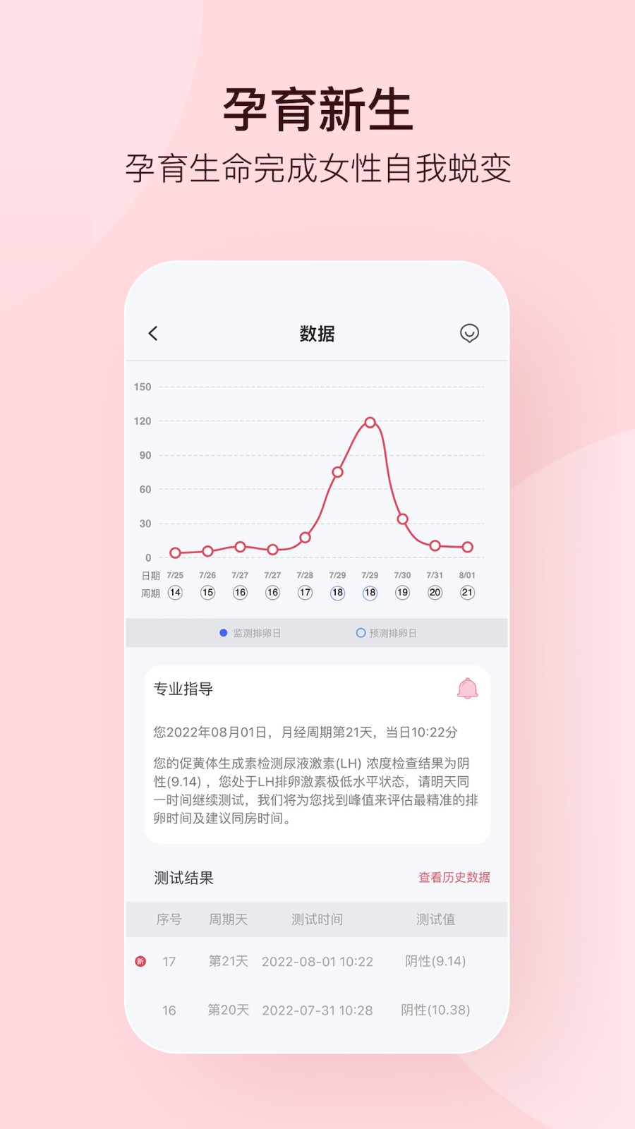 ·数据功能:自动绘制每个周期的指标曲线,快速定位峰值,准确判断排卵时间。