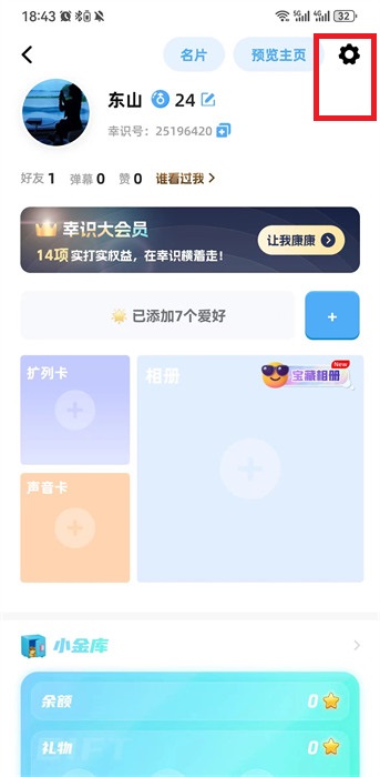 2、在个人主页界面中点击右上角的【齿轮设置】按钮,进入到设置页面;