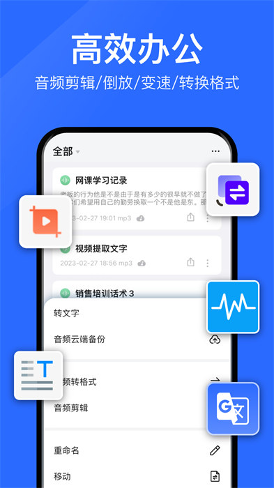 支持按句回听,同步编辑,文本快速导出、分享,并支持直接复制,txt、word格式。