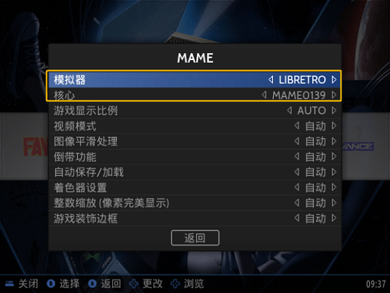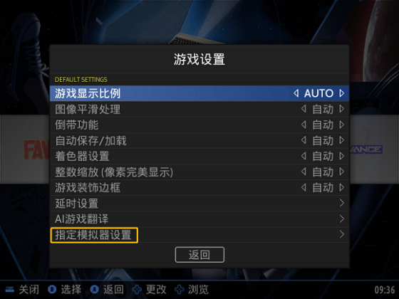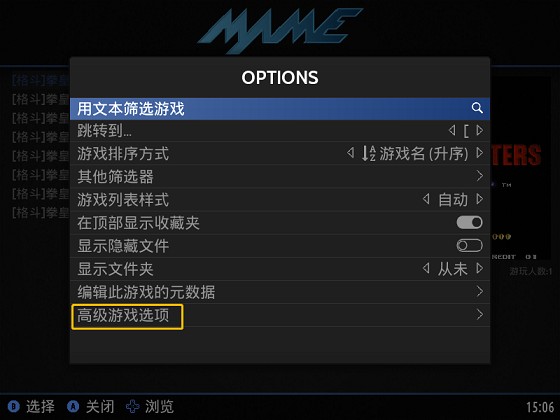 方法:选中这个游戏,按【选项】按钮,选择高级游戏选项,修改模拟器核心。(见下图)
