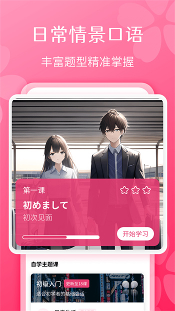 日语自学习这款软件能够带你轻松学习日语,app支持非常多的学习方式,可以根据你的个人需要进行学习,从入门日语到商务日语,非常多种多样,还能够跟着动漫一起学,同时也可以通过题库巩固日语基础哦,感兴趣的话来下载吧!