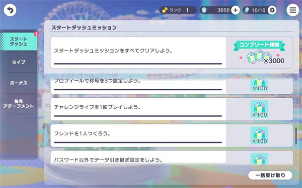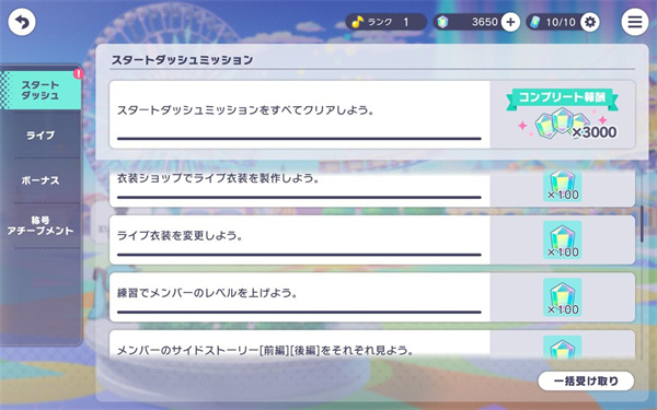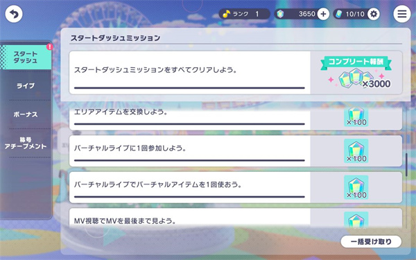 前5个完成方法很简单、进入MAINSTORY(主线剧情)、选择各个团,右上角改一下“開催順”,选择第一章(章节带有“メインストーリー”),每个团的第一章点进去,完成下图红色圈出来的部分。
