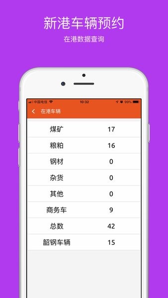 本APP仅应用于新港码头汽车疏港作业,司机可通过注册并登录预约管理软件录入车牌号、将要提取的货物及预约时间,管理员审核后车辆即可在预约时段到港(仓)提货。包含功能有预约车辆(长期代理车辆、长期非代理车辆、临时代理车辆、临时非代理车辆)、预约查询、查询在港车辆功能。