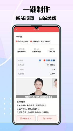 根据您需要的规格自动裁剪,算法确保人像的正确位置及比例,底色随意选,更有多种高级底色,让您的证件照与众不同!