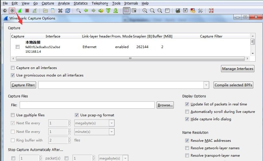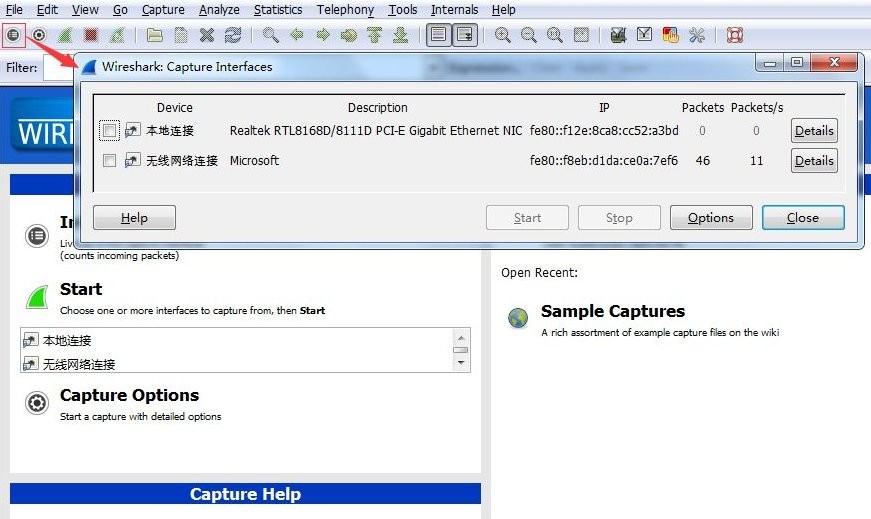 打开wireshark,点击抓取网络接口卡选择按钮,选择需要抓取的网卡接口。