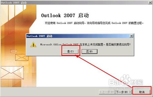 2、第一次启动outlook的时候会弹出一个设置向导,你可以使用该向导来设置outlook,当然也可以关闭该向导(点击取消按钮,然后点击是),然后去工具里设置,下面讲讲这两种设置的方法。先用向导来设置就是,看到outlook 2007 启动这个界面的时候,点击下一步