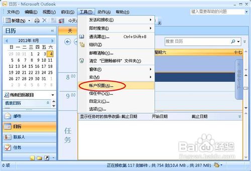 6、上面是利用向导来设置outlook,下面我们要手动设置了,进入outlook以后,我们在工具菜单下,打开账户设置。